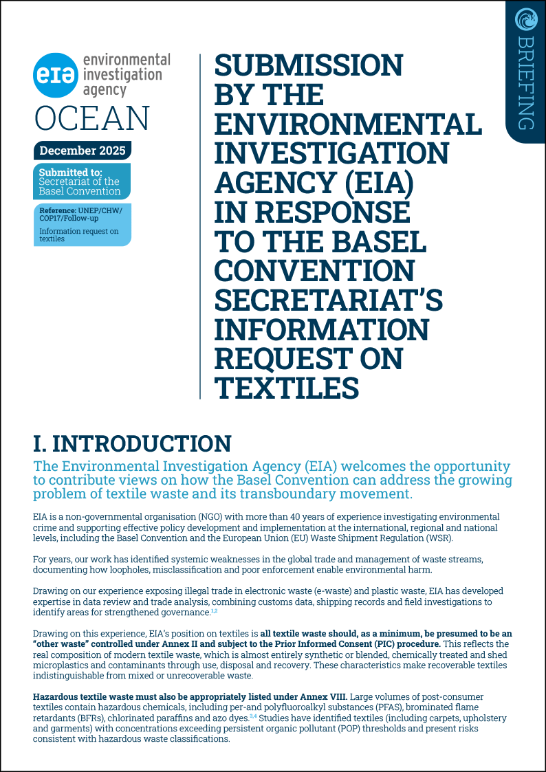 Submission by the Environmental Investigation Agency (EIA) in response to the Basel convention secretariat’s information request on textiles