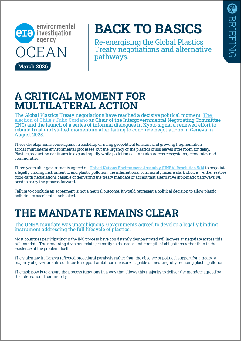 At the fifth session of the United Nations Environment Assembly (UNEA-5) in 2022, the world celebrated as resolution 5/14 was adopted, convening an intergovernmental negotiating committee (INC) to develop an international legally binding instrument to end plastic pollution. Since that high point, however, the process has steadily derailed. As we reflect on where we are and how to get where we need to be, in this briefing EIA experts outline the essential conditions for a successful resolution of the negotiations and recommendations for urgent course correction.